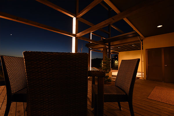 宿泊者だけが望めるオープンテラス。天気の良い日は美しい湖と夕日の幻想的なシーンをご覧いただけます。